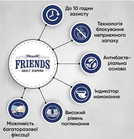 Якщо ви шукаєте продукт преміум-класу, виберіть підгузники-труси для дорослих Friends Premium, які створять відчуття комфорту та доступні в розмірах M, L, XL.