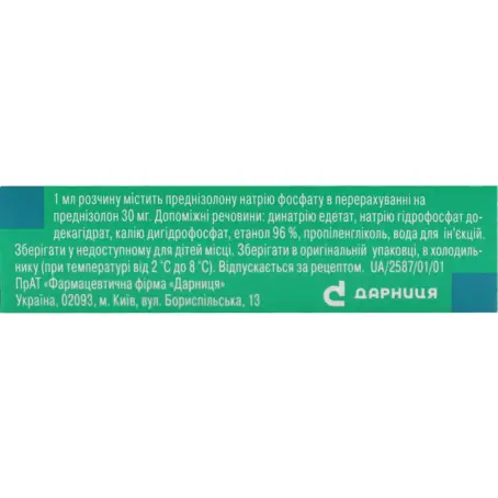 1 мл розчину містить преднізолону натрію фосфату в перерахуванні на преднізолон 30 мг;