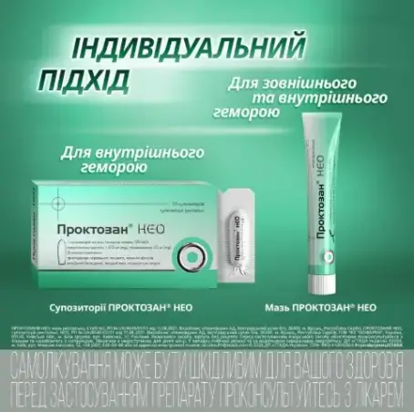 Фармакодинаміка.Проктозан® НЕО забезпечує ефективне лікування характерних симптомів та наслідків геморою. Препарат швидко усуває запалення в аноректальній ділянці, а також супутні відчуття, такі як свербіж, печіння, поколювання, біль та відчуття вологості.