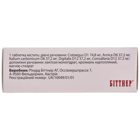 діючі речовини: 1 таблетка містить: Crataegus D1 74,8 мг, Arnica D6 37,2 мг, Kalium carbonicum D6 37,2 мг, Digitalis D12 37,2 мг, Convallaria D12 37,2 мг;