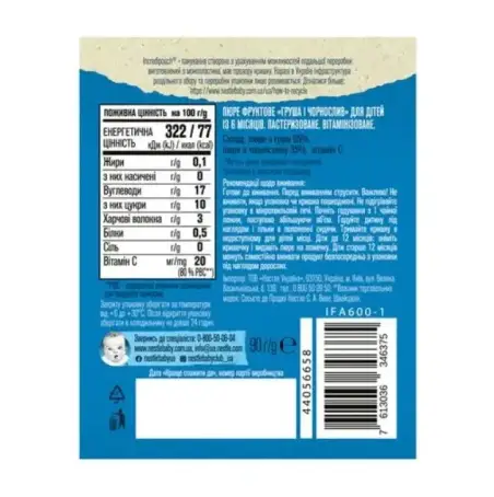 Пюре з груш (65%), пюре з чорносливу (35%), вітамін С. Без ГМО. Без додавання крохмалю й цукру.
