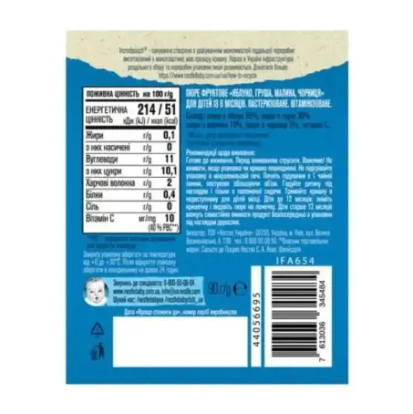 Пюре з яблук (55%), пюре з груш (30%), пюре з малини (10%), пюре з чорниці (5%), вітамін С. Без ГМО.
