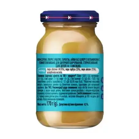 Склад: яблучне пюре (49,95%), пюре з гарбуза (35%), пюре з айви (15%)