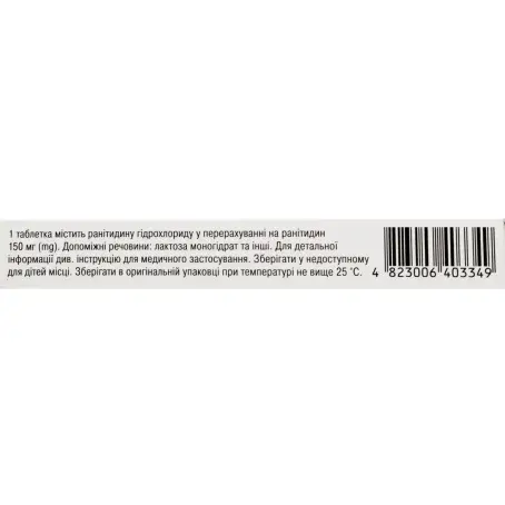 1 таблетка містить ранітидину гідрохлориду у перерахуванні на ранітидин 150 мг;
