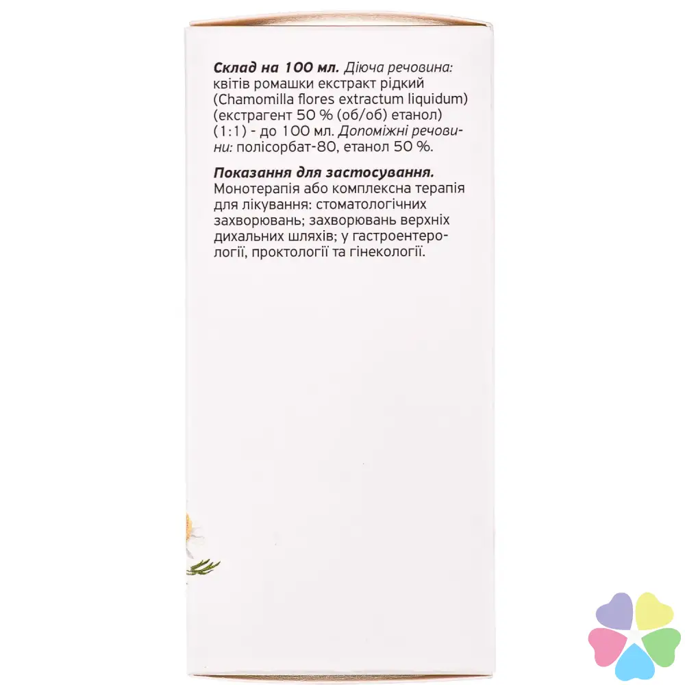 Склад: квітів ромашки екстракт рідкий (Chamomilla flores extractum liquidum) (екстрагент 50% (об/об) етанол) (1:1) - до 100 мл (Extractum Chamomillae aquosum-spirituosum)