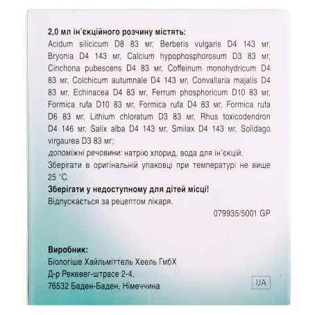 Склад: 2,0 мл розчину містять: Acidum silicicum D8 - 83 мг, Berberis vulgaris D4 - 143 мг, Bryonia D4 - 143 мг, Calcium hypophosphorosum D3 - 83 мг, Cinchona pubescens D4 - 83 мг, Coffeinum monohydricum D4 - 83 мг, Colchicum autumnale D4 143 мг, Convallaria majalis D4 - 83 мг, Echinacea D4 - 83 мг, Ferrum phosphoricum D10 - 83 мг, Formica rufa D10 - 83 мг, Formica rufa D4 - 83 мг, Formica rufa D6 - 83 мг, Lithium chloratum D3 - 83 мг, Rhus toxicodendron D4 - 146 мг, Salix alba D4 - 143 мг, Smilax D4 - 143 мг, Solidago virgaurea D3 - 83 мг (Colchicum autumnale D4)