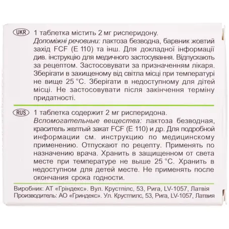 1 таблетка містить 2 мг або 4 мг рисперидону;