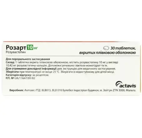 Склад: 1 таблетка вкрита плівковою оболонкою, містить розувастатину 10 мг у вигляді 10,42 мг розувастатину кальцію (Rosuvastatinum)