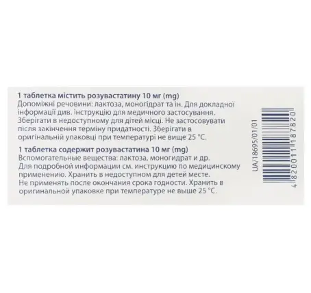 1 таблетка містить розувастатину 10 мг або 20 мг;