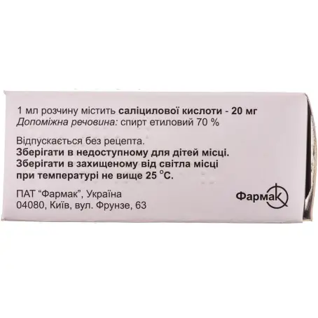 Склад: 1 мл розчину містить саліцилової кислоти 20 мг (ACIDUM SALICYLICUM)