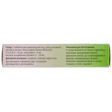 Склад: 1 таблетка для смоктання містить: екстракту з листя шавлії густого (Salvia officinalis) (3.4-4.6:1) - 50 мг, олії шавлії - 6 мг, кислоти аскорбінової (вітаміну С) - 20 мг (Extractum foliorum Salvii spissum)