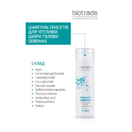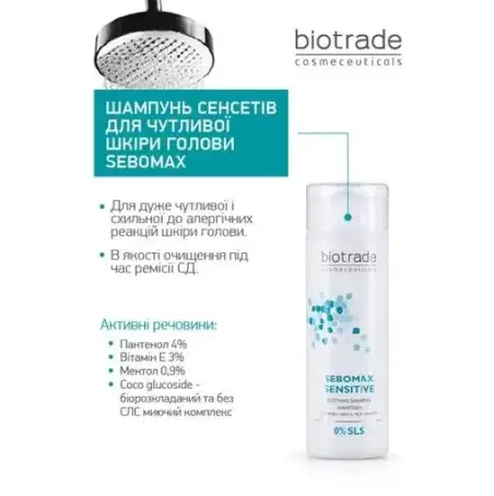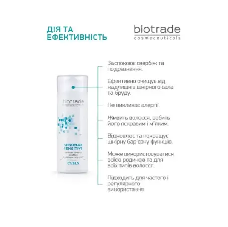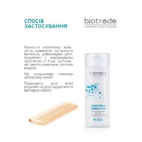 Щоб підсилити дію шампуню Biotrade Sebomax Sensitive, використовуйте його в комплексі з відновлювальним бальзамом, маскою та олією для волосся.