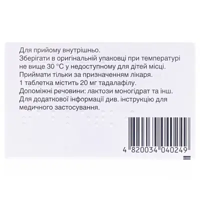 Складдіюча речовина: 1 таблетка містить 20 мг тадалафілу;