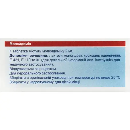 З обережністю призначати при гіпертрофічній обструктивній кардіоміопатії, констриктивному перикардиті, зниженні тиску у шлуночках серця, при стенозі аорти або мітральному стенозі. При вираженому порушенні функції печінки (збільшення бромсульфалеїнової проби на 20-50%) збільшується концентрація молсидоміну в плазмі крові та збільшується період напіввиведення, що потребує коригування дози препарату.