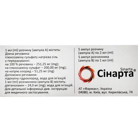1 мл розчину містить глюкозаміну сульфату натрієвої солі у перерахуванні на 100% речовину - 251,25 мг, у перерахуванні на глюкозаміну сульфат - 200 мг, у перерахуванні на натрію хлорид - 51,25 мг;