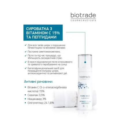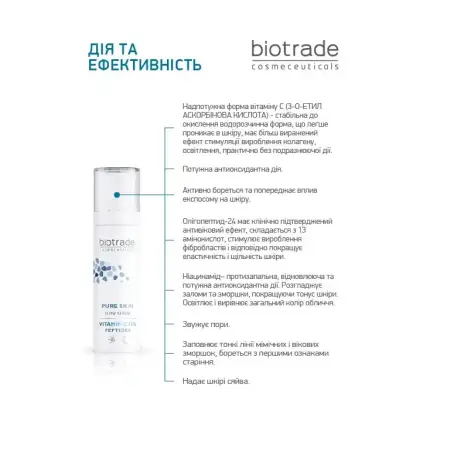 Cироватка містить удосконалену, ультра-сильну та стабільну форму вітаміну С, яка легко проникає в шкіру і покращує синтез колагену, при цьому не має подразнюючої дії. Поєднання з пептидами у складі забезпечує ефективний антиейдж догляд.