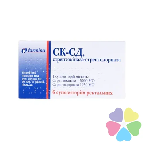 Фармакологічні властивості.Фармакодинаміка.Лікарський засіб «СК-СД, стрептокіназа-стрептодорназа», супозиторії, діє місцево після ректального застосування. Стрептокіназа діє як фібринолітик та розчиняє фібринові та інші згустки. Стрептодорназа розчиняє дезоксирибонуклеопротеїди та дезоксирибонуклеокислоти, у результаті чого знижується в’язкість гнійних ексудатів і розчиняються мертві клітини.