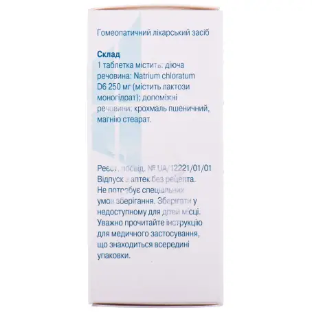 1 таблетка міститьNatrium chloratum D6 250 мг (містить лактози моногідрат);