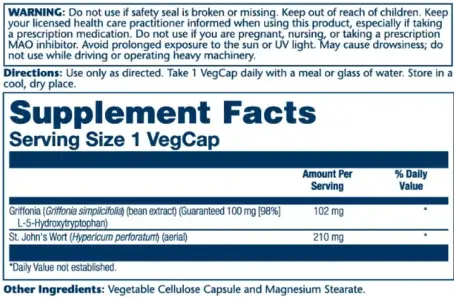 - Griffonia (екстракт бобів) (гарантовано 100 мг [98%] L-5-гідрокситриптофан) 102 мг