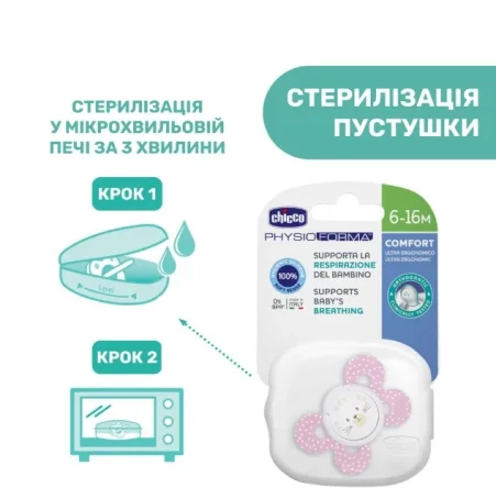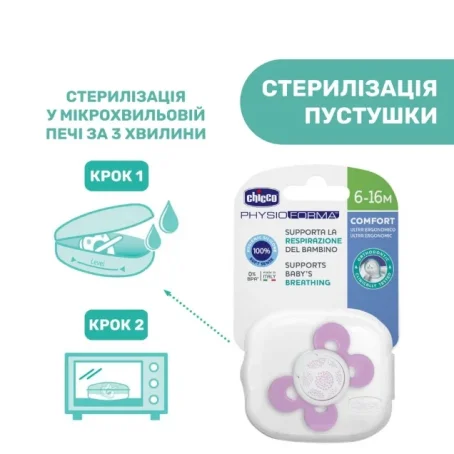контейнер для зберігання дозволяє дезінфікувати пустушку в мікрохвильовій печі, видаляючи 99,9% шкідливих мікробів всього за 3 хвилини
