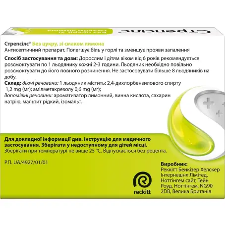 Лікарський засіб: СТРЕПСІЛС БЕЗ ЦУКРУ, ЗІ СМАКОМ ЛИМОНА (STREPSILS WITHOUT SUGAR, LEMON FLAVOUR)