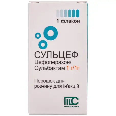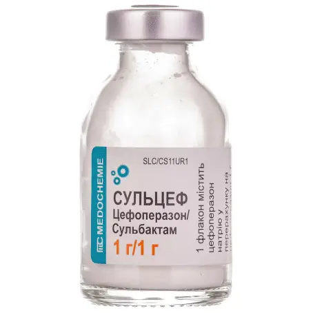 Склад: 1 флакон містить цефоперазон натрію у перерахунку на цефоперазон 1 г та сульбактам натрію у перерахунку на сульбактам 1 г (Sulbactam)