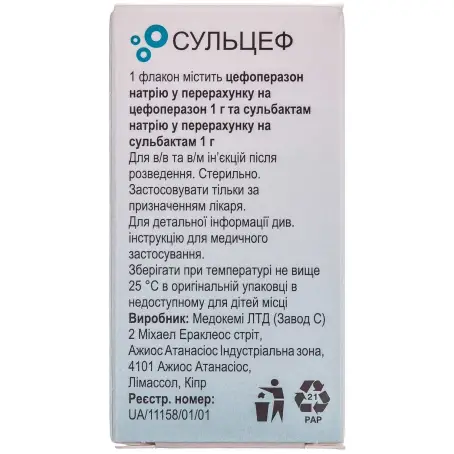 1 флакон містить цефоперазон натрію у перерахунку на цефоперазон 1 г та сульбактам натрію у перерахунку на сульбактам 1 г;