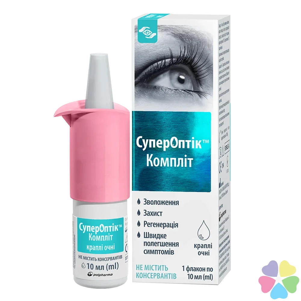 СуперОптік Компліт не містить консервантів і тому добре переноситься, та може використовуватися довготривало. Якщо симптоми подразнення зберігаються, незважаючи на застосування очних крапель, слід звернутися до лікаря-офтальмолога.