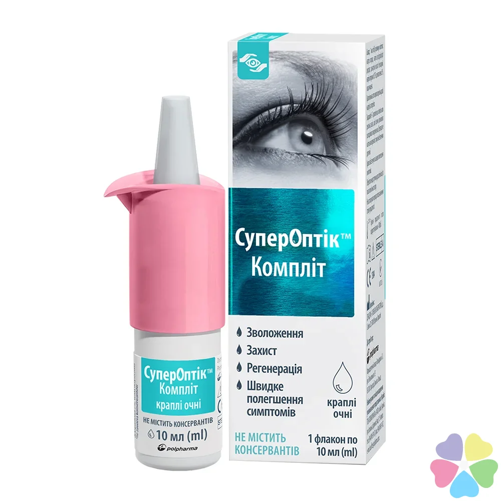 СуперОптік Компліт зволожує, захищає та формує захисну плівку на поверхні очей, усуваючи дискомфорт пов’язаний із: