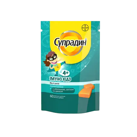 Вітаміни та мінерали, компоненти Супрадін Імуно Кідз, сприяють підвищенню опірності до інфекцій, прискорюють відновлення після перенесених захворювань, необхідні для нормального функціонування імунітету, беруть участь в захисті клітин від оксидативного стресу. Залізо входить до складу гемоглобіну, необхідне для функціонування еритроцитів, і сприяє зменшенню втоми. Залізо, цинк і обліпиха беруть участь в імунному захисті організму. Також, цинк і обліпиха є антиоксидантами.