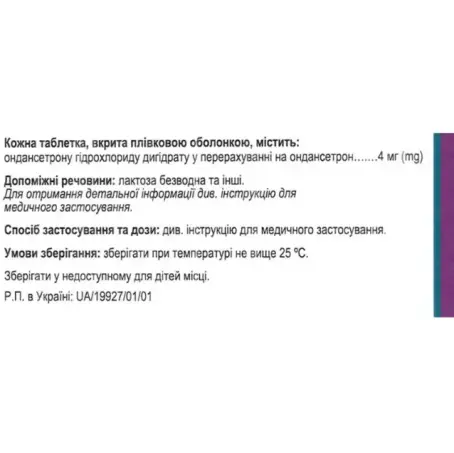 кожна таблетка, вкрита плівковою оболонкою, містить ондансетрону гідрохлориду дигідрату у перерахуванні на ондансетрон 4 мг або ондансетрону гідрохлориду дигідрату у перерахуванні на ондансетрон 8 мг.