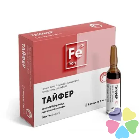 Взаємодія з іншими лікарськими засобами та інші види взаємодіїЛікарський засіб Тайфер показаний пацієнтам, яким не можуть бути призначені пероральні препарати заліза у зв’язку з їх непереносимістю, неефективністю або наявністю захворювань шлунково-кишкового тракту. Не слід одночасного застосовувати лікарський засіб Тайфер зі залізовмісними пероральними засобами, оскільки абсорбція заліза, яке застосовують внутрішньо, знижується.