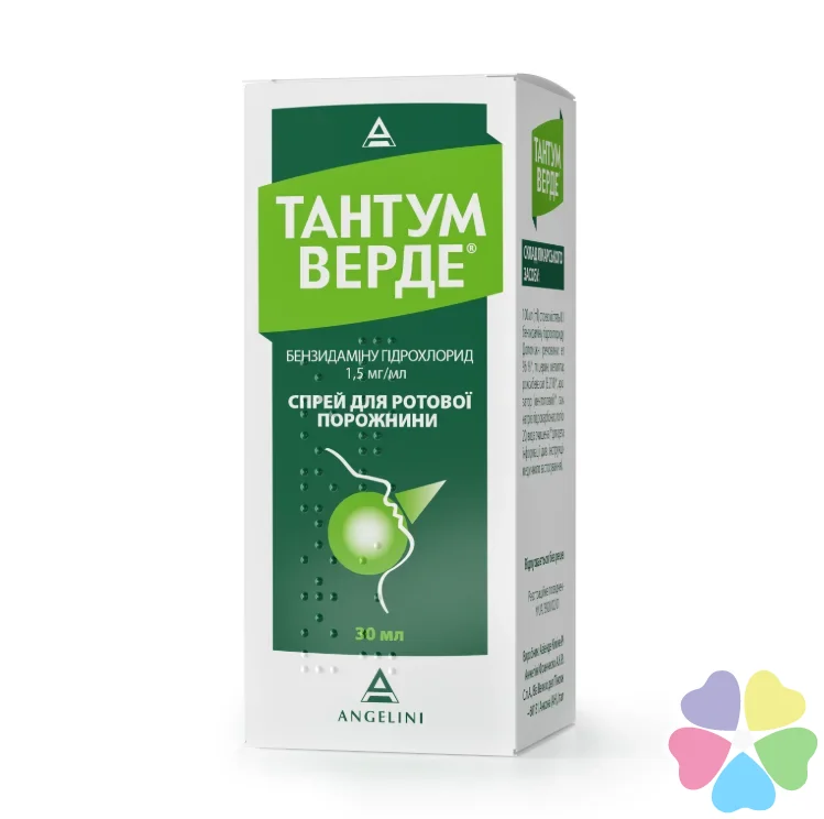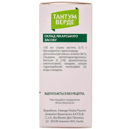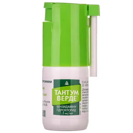 Тантум Верде®, спрей для ротової порожнини, містить ароматизатор (ментоловий), який у свою чергу містить бензиловий спирт, коричний спирт, цитраль, цитронелол, гераніол, ізоевгенол, ліналоол, евгенол та D-лімонен які можуть викликати алергічні реакції.