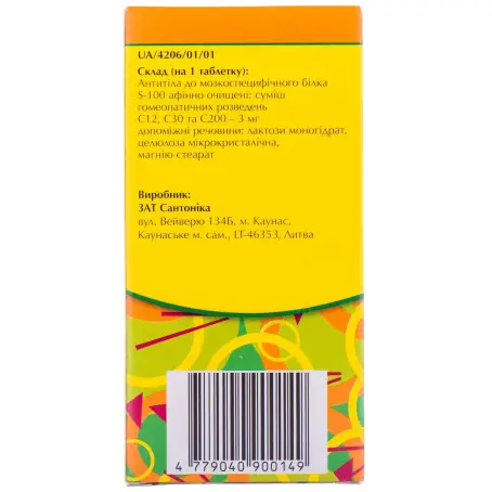 Склад: 1 таблетка містить антитіла до мозкоспецифічного білка S-100 афінно очищені: суміш гомеопатичних розведень С12, С30 та С200 - 3 мг