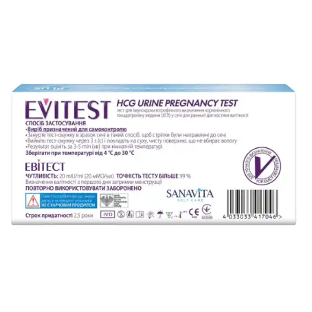 ОписЯкщо у Вас з’явились сумніви, щодо результатів тесту, Ви можете провести повторний тест. Для цього використовуйте упаковку EVITEST PLUS, до складу якої входить 2 тест-смужки. Повторний тест необхідно проводити через 2 доби, оскільки концентрація ХГЛ в організмі вагітної жінки подвоюється протягом 48 годин.