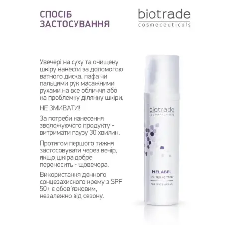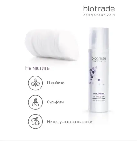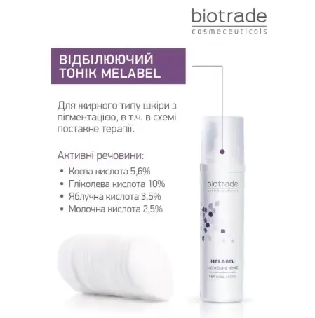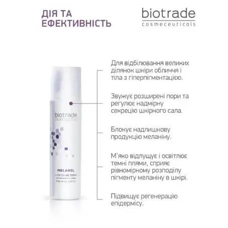 Відбілюючий тонік MELABEL від бренду дерматологічної косметики BIOTRADE - це продукт для шкіри з гіперпігментованими ділянками, а також для жирної шкіри з розширеними порами та пігментними слідами після прищів.