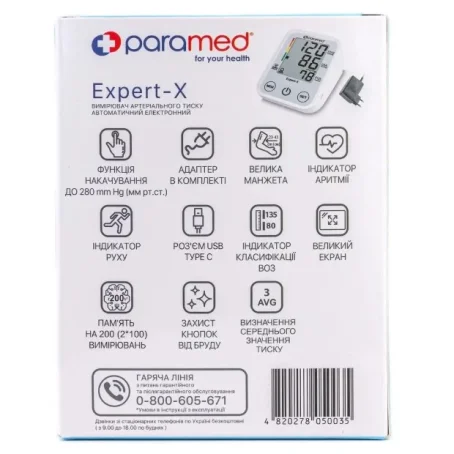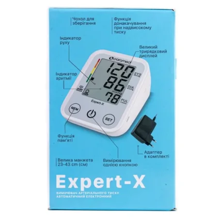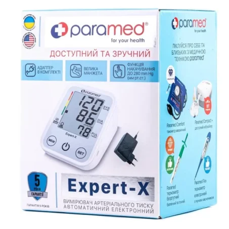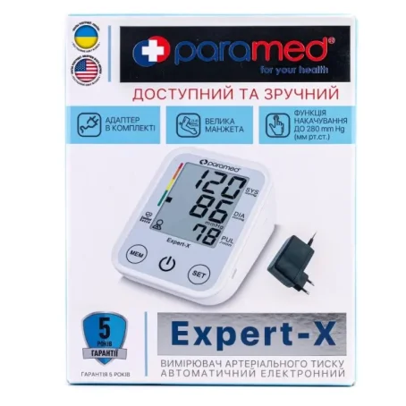 Paramed Expert-X - доступний і надійний тонометр автоматичного типу. Оснащений універсальною манжетою для обхвату руки 22-42 см (підходить як на худеньке, так і широке плече). Працює від мережевого адаптера, який входить до комплекту, або батарейок. Відрізняється від бюджетних моделей великим екраном і пам'яттю на 60 результатів вимірювань з можливістю установки дати і часу. Підходить для використання вдома або в професійній діяльності.
