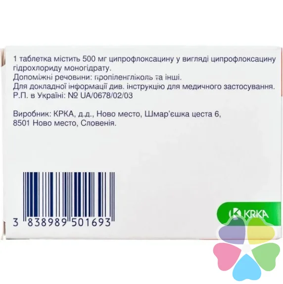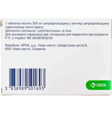 Склад: 1 таблетка, вкрита плівковою оболонкою, містить 500 мг ципрофлоксацину у вигляді ципрофлоксацину гідрохлориду моногідрату (CIPROFLOXACINUM)