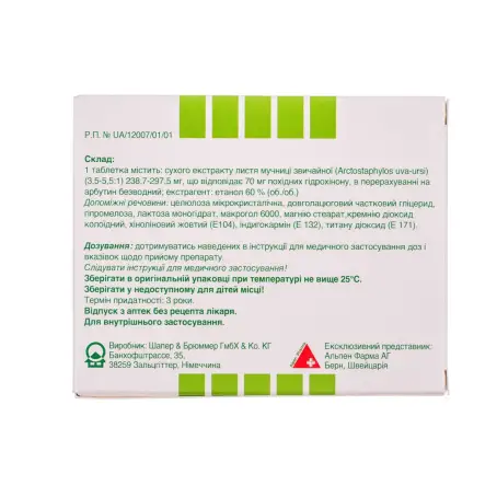 Склад: 1 таблетка містить сухого екстракту листя мучниці звичайної (Arctostaphylos uva-ursі) (3,5-5,5:1) 238,7-297,5 мг, що відповідає 70 мг похідних гідрохінону, у перерахуванні на арбутин безводний; екстрагент: етанол 60% (об/об) (Extract Arctostaphyli uvae ursi (3,5-5,5:1))