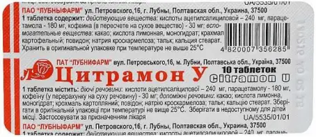 діючі речовини: 1 таблетка містить кислоти ацетилсалiциловoї 240 мг, парацетамолу 180 мг, кофеїну (у перерахунку на суху речовину) 30 мг;