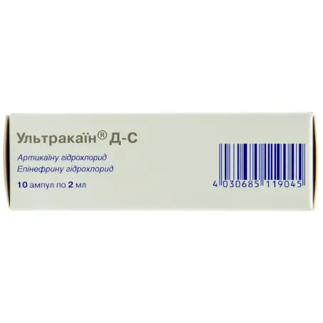 Ультракаїн® Д-С - місцевий анестетик амідного типу, який застосовують у стоматології для інфільтраційної та провідникової анестезії. Препарат має швидкий початок дії (латентний період - 1-3 хвилини), сильний знеболювальний ефект. Тривалість ефективної анестезії становить приблизно 45 хвилин.