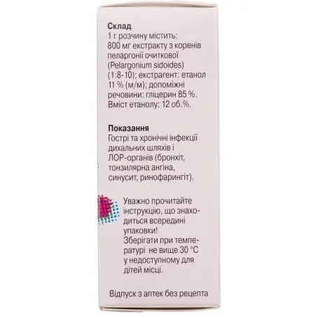 1 г розчину містить 800 мг екстракту з коренів Pelargonium sidoides (пеларгонії очиткової) (1:8-10), екстрагент: етанол 11% (м/м);