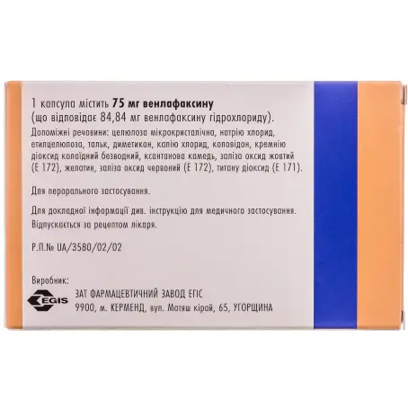 1 капсула містить 37,5 мг або 75 мг, або 150 мг венлафаксину (що відповідає 42,42 мг або 84,84 мг, або 169,68 мг венлафаксину гідрохлориду);