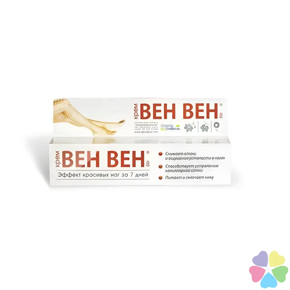 Крем Вен-Вен 50 г – препарат на растительной основе для оптимизации процесса кровообращения, снятия усталости и отечности ног, предотвращения капиллярной сетки, смягчения и питания кожного покрова.