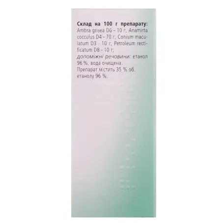Склад: 100 г препарату містять: Ambra grisea D6 - 10 г, Anamirta cocculus D4 -70 г, Conium maculatum D3 - 10 г, Petroleum rectificatum D8 - 10 г;/1 мл препарату містить 21 краплю (Anamirta cocculus D4)