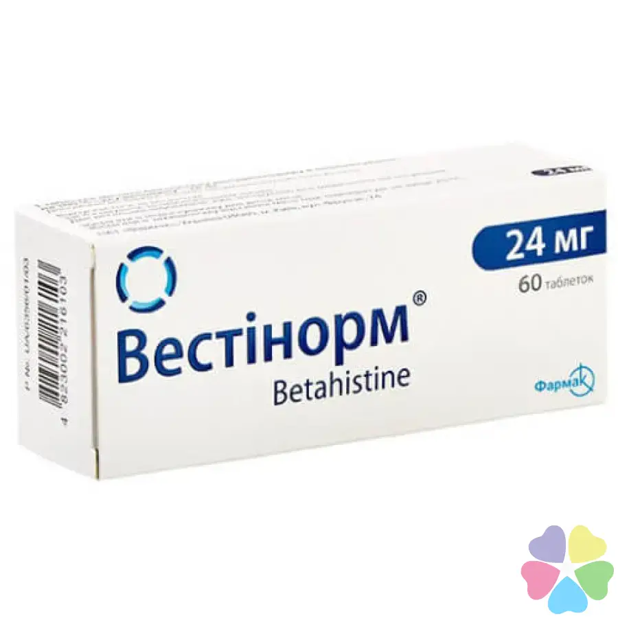 Склад: 1 таблетка містить бетагістину дигідрохлориду 24 мг у перерахуванні на 100% суху речовину (Betahistini dihydrochloridum)