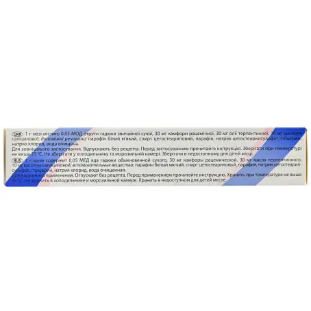 Основні фізико-хімічні властивості: мазь білого або білого зі злегка жовтуватим відтінком кольору з запахом камфори та олії терпентинної.