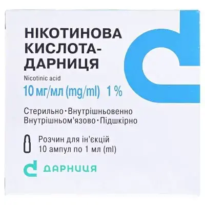 Інші показання. Призначати підшкірно або внутрішньом’язово по 10 мг (1 мл) 1 раз на день протягом 10-15 днів. Можливе додавання в інфузійний розчин: 10 мг (1 мл) нікотинової кислоти на 100-200 мл інфузійного розчину.