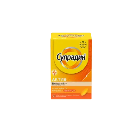 Супрадин Актив таблетки, в/плів. обол. №30 у флак. можна купити в наших аптеках зараз тут:  Ужвій, Золотоустівська,  Андрея Верхогляда,  Дарницька площа,  6 лікарня, Лук'яненка 29, Петропавлівська Борщагівка,  Амеда, Метрологічна,  Медіком,  Русанівка, Оболонь,  Олександрівська лікарня, Крюківщина,  Айхоум,  Петрівський квартал,  Дипломат-Хол, Глеваха, Палладіна,  Республіка-2,  Карат, Балтійський, Софіївська Борщагівка, Білогородка,  Лоток, Гатне,  Іподром, Березнева,  Comfort Town 3,  Верхогляда, Садова 2, Караваєві Дачі,  Соцмісто, Берковецька