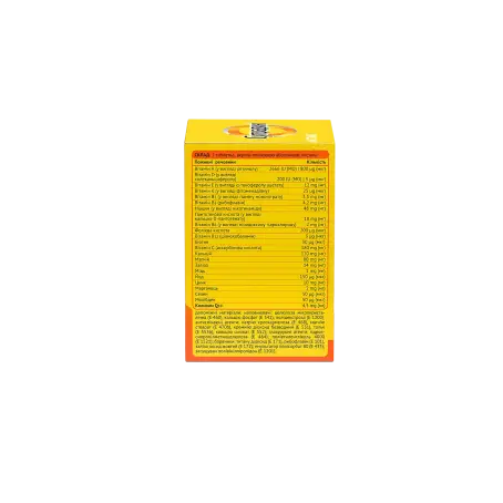 інші інгредієнти: целюлоза мікрокристалічна (Е460), натрію кроскармелоза (Е468), магнію стеарат (Е470b), кремнію діоксид безводний (Е551), полівінілпіролідон (Е1201), кальцію фосфат (Е341), кремнію діоксид, кальцію силікат (Е552), гідроксипропілметилцелюлоза ( Е464), титану діоксид (Е171), полідекстроза (Е1200), тальк (Е553b), поліетиленгліколь 4000 (Е1521), рибофлавін (Е101), заліза оксид жовтий (Е172), полісорбат 80 (Е433), вода очищена.